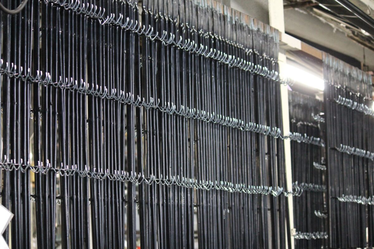 製品に応じた工程調整や仕上がり管理を行い、安定した品質を保つ吊るしメッキライン。液剤や洗浄工程、設備環境にも日常的に配慮しています。